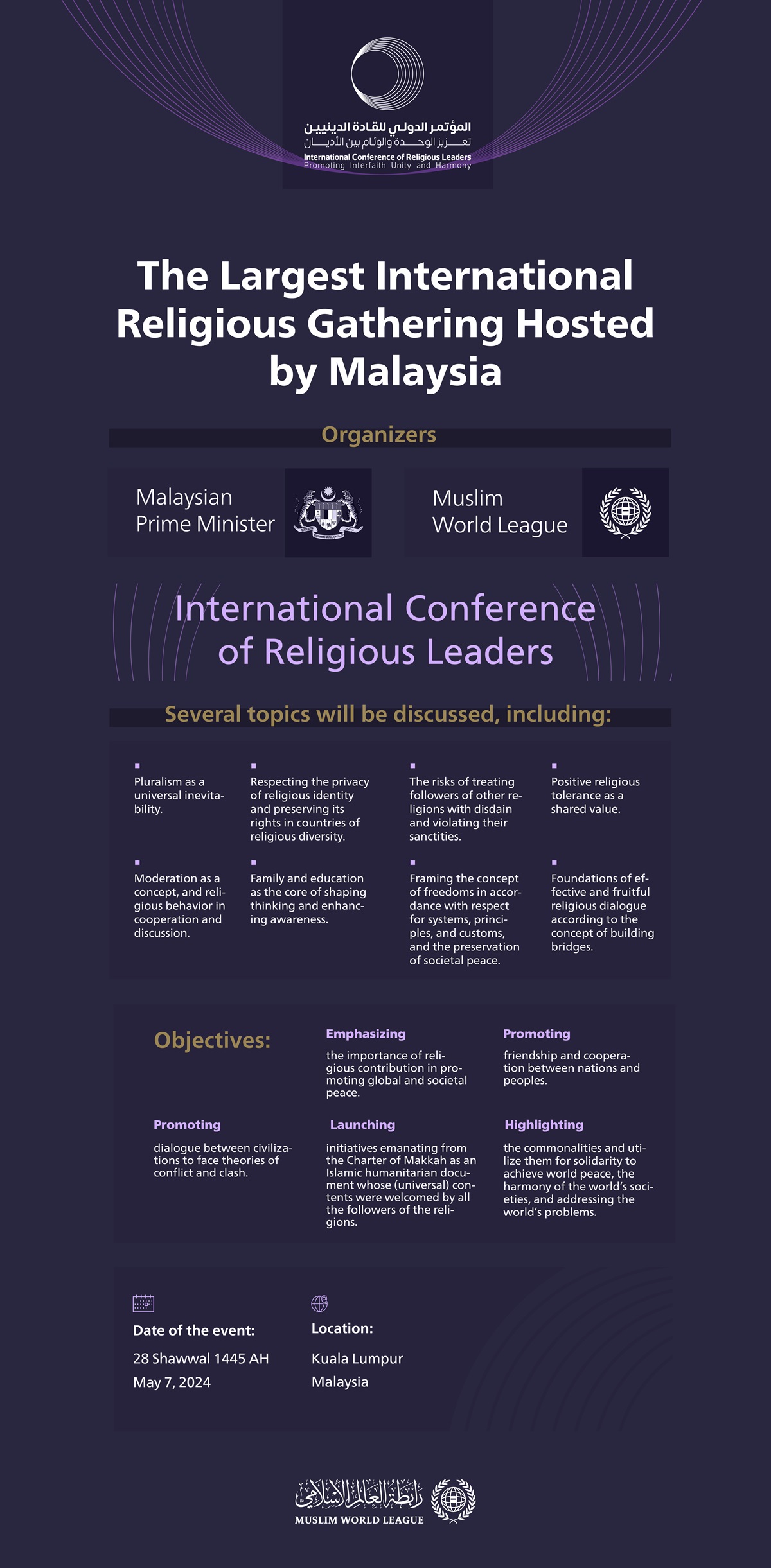 Organized by the Malaysian Prime Minister and the Muslim World League, The capital Kuala Lumpur hosts the International Conference of Religious Leaders