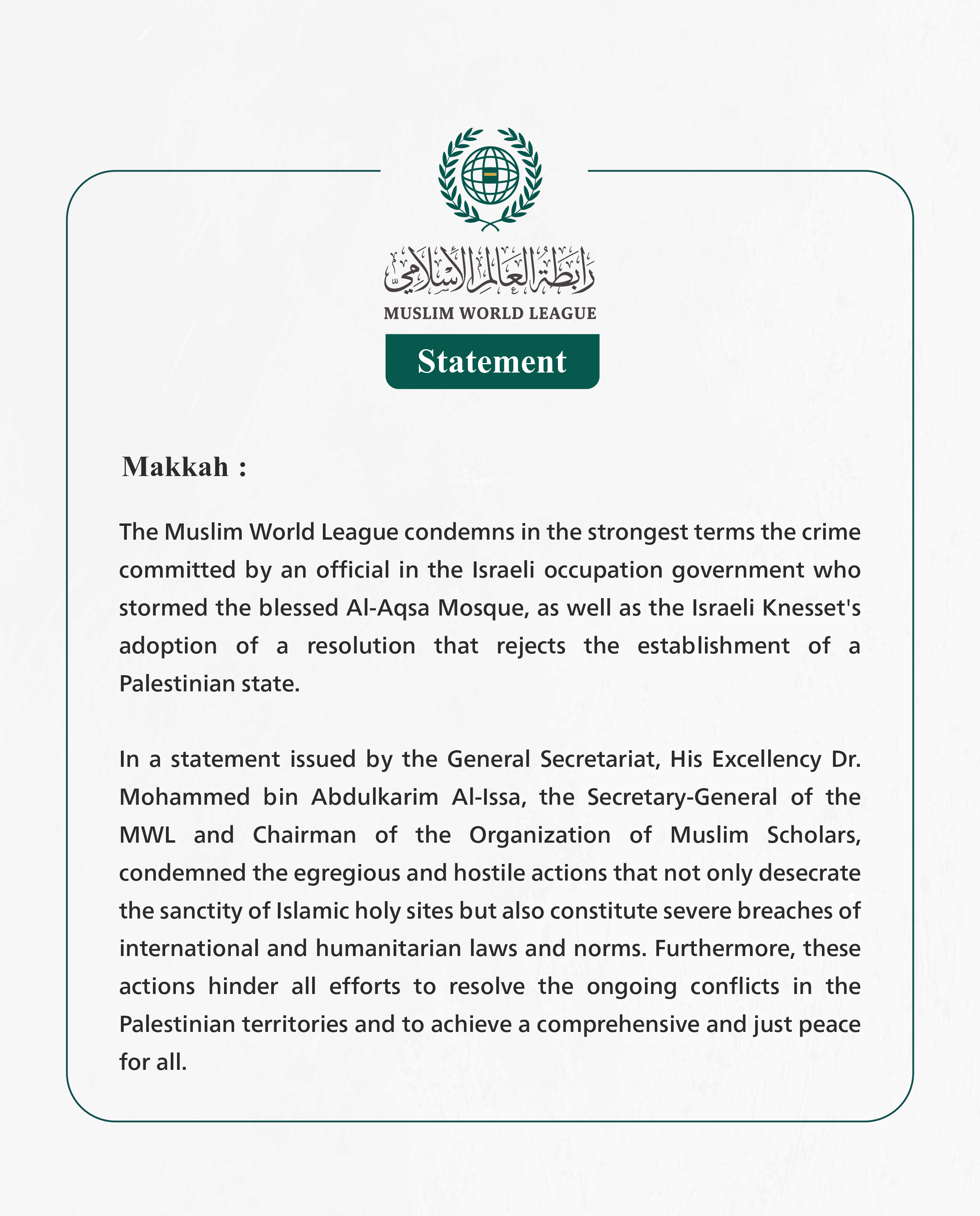 The Muslim World League condemns in the strongest terms the crime committed by an official in the Israeli occupation government who stormed the blessed Al-Aqsa Mosque, as well as the Israeli Knesset's adoption of a resolution that rejects the establishment of a Palestinian state.