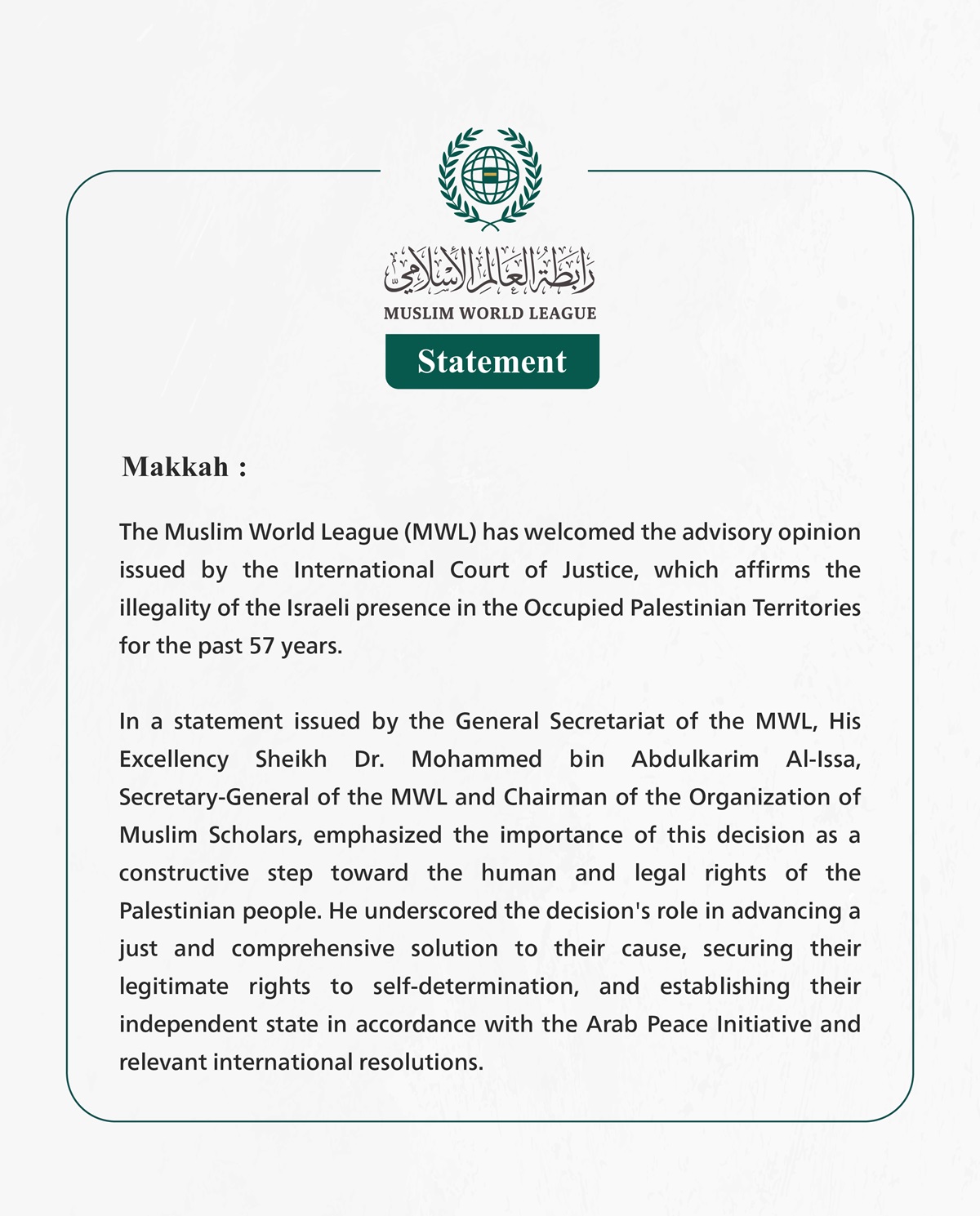 The Muslim World League (MWL) has welcomed the advisory opinion issued by the International Court of Justice, which affirms the illegality of the Israeli presence in the Occupied Palestinian Territories for the past 57 years.