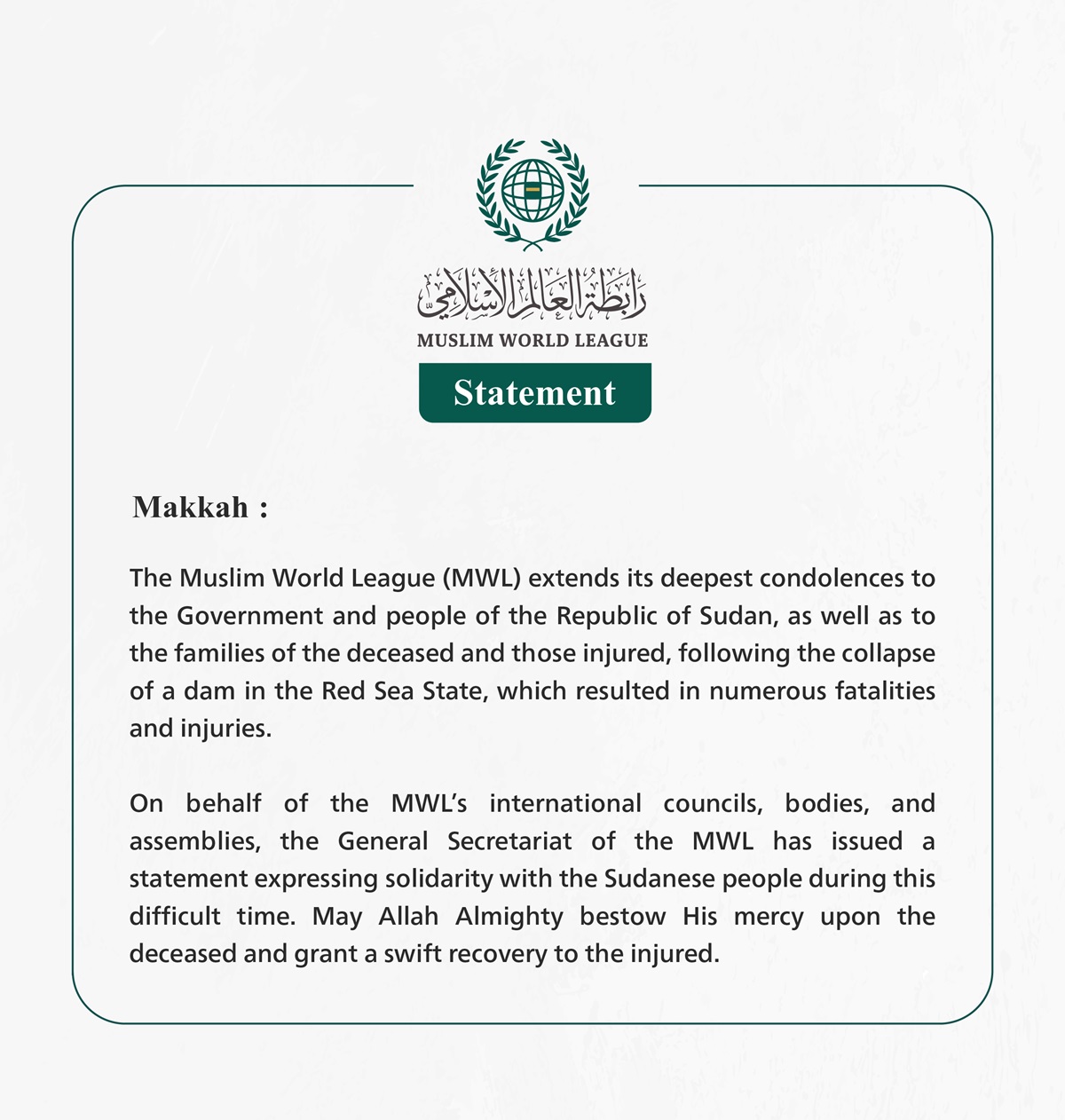 The Muslim World League (MWL) extends its deepest condolences to the Government and people of the Republic of Sudan, as well as to the families of the deceased and those injured, following the collapse of a dam in the Red Sea State, which resulted in numerous fatalities and injuries.