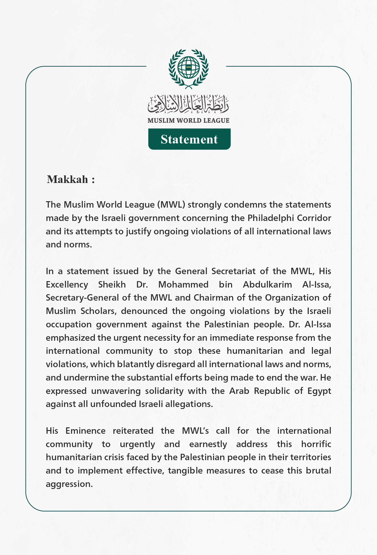 The Muslim World League (MWL) strongly condemns the statements made by the Israeli government concerning the Philadelphi Corridor and its attempts to justify ongoing violations of all international laws and norms.