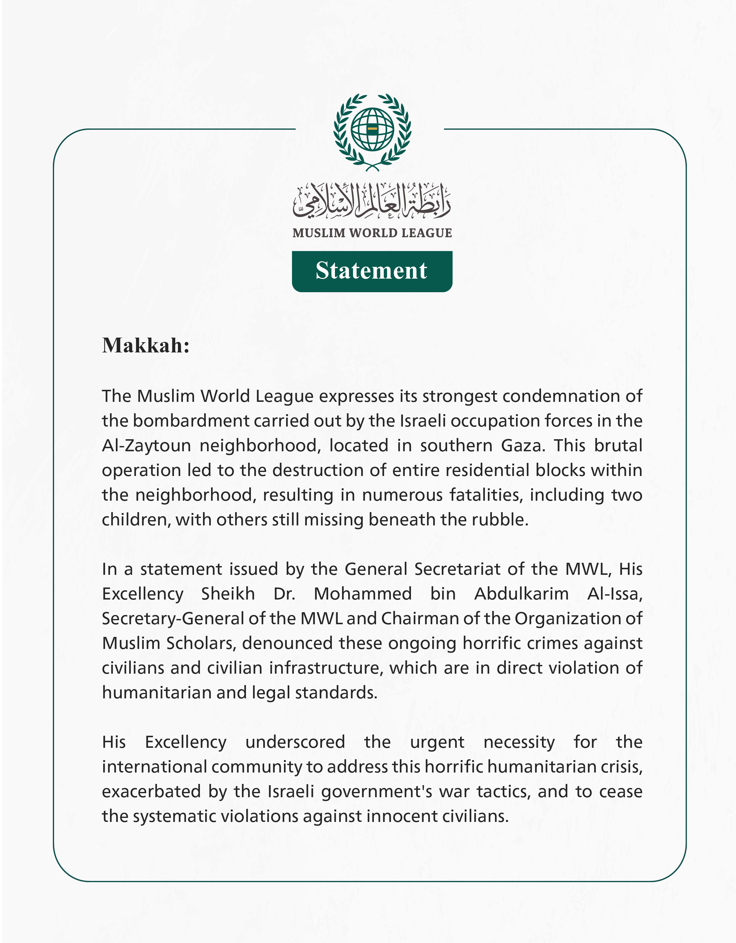 The Muslim World League expresses its strongest condemnation of the bombardment carried out by the Israeli occupation forces in the Al-Zaytoun neighborhood, located in southern Gaza. This brutal operation led to the destruction of entire residential blocks within the neighborhood, resulting in numerous fatalities, including two children, with others still missing beneath the rubble.