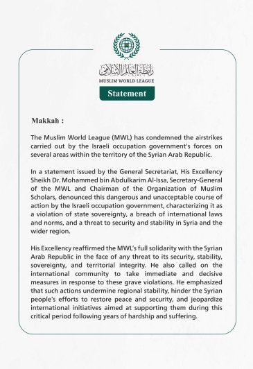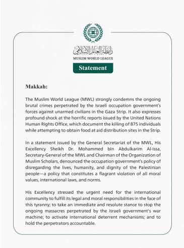 In a statement issued by the General Secretariat of the MWL, His Excellency Sheikh Dr. Mohammed bin Abdulkarim Al-Issa, Secretary-General of the MWL and Chairman of the Organization of Muslim Scholars, denounced these ongoing horrific crimes against civilians and civilian infrastructure, which are in direct violation of humanitarian and legal standards.
