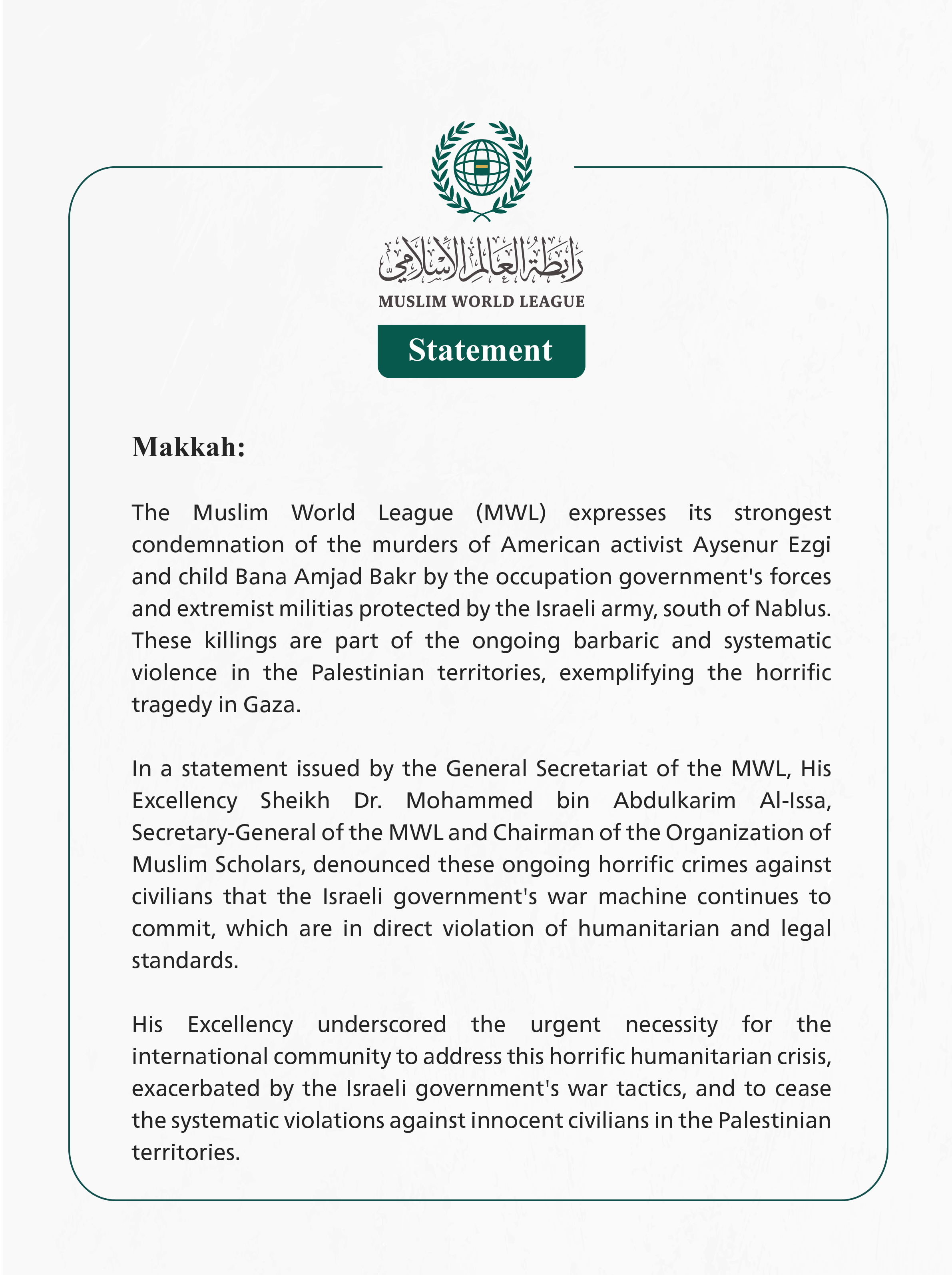 The Muslim World League (MWL) expresses its strongest condemnation of the murders of American activist Aysenur Ezgi and child Bana Amjad Bakr by the occupation government's forces and extremist militias protected by the Israeli army, south of Nablus. These killings are part of the ongoing barbaric and systematic violence in the Palestinian territories, exemplifying the horrific tragedy in Gaza.