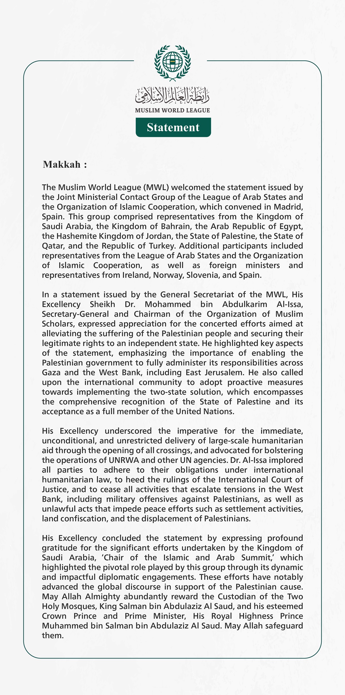 The Muslim World League (MWL) welcomed the statement issued by the Joint Ministerial Contact Group of the League of Arab States and the Organization of Islamic Cooperation, which convened in Madrid, Spain. This group comprised representatives from the Kingdom of Saudi Arabia, the Kingdom of Bahrain, the Arab Republic of Egypt, the Hashemite Kingdom of Jordan, the State of Palestine, the State of Qatar, and the Republic of Turkey. Additional participants included representatives from the League of Arab States and the Organization of Islamic Cooperation, as well as foreign ministers and representatives from Ireland, Norway, Slovenia, and Spain.