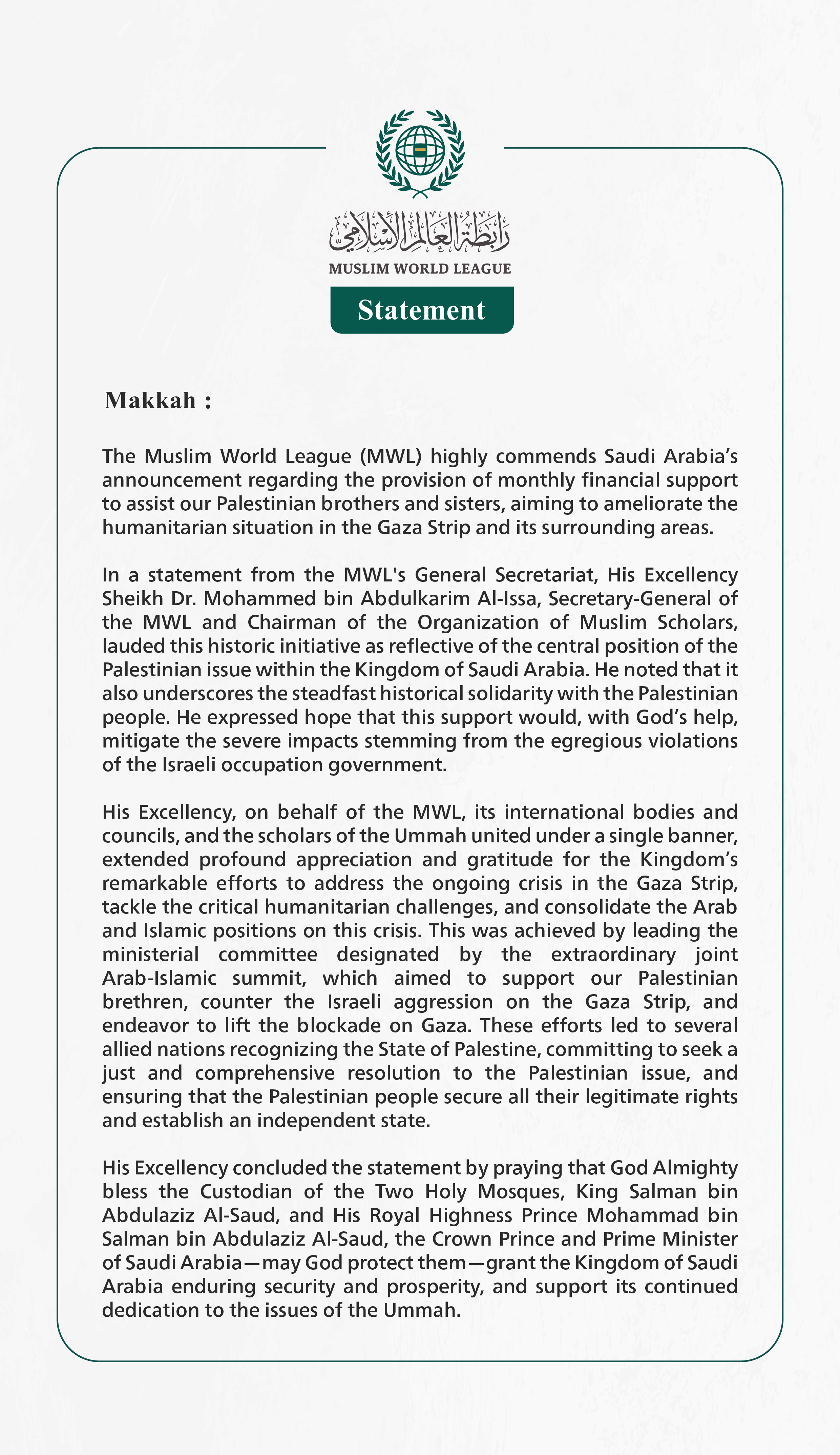 The Muslim World League (MWL) highly commends Saudi Arabia’s announcement regarding the provision of monthly financial support to assist our Palestinian brothers and sisters, aiming to ameliorate the humanitarian situation in the Gaza Strip and its surrounding areas.
