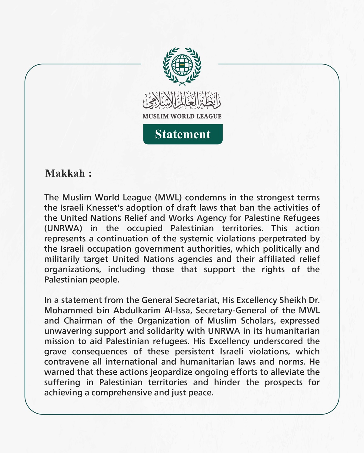The Muslim World League (MWL) condemns in the strongest terms the Israeli Knesset's adoption of draft laws that ban the activities of the United Nations Relief and Works Agency for Palestine Refugees (UNRWA) in the occupied Palestinian territories. This action represents a continuation of the systemic violations perpetrated by the Israeli occupation government authorities, which politically and militarily target United Nations agencies and their affiliated relief organizations, including those that support the rights of the Palestinian people.