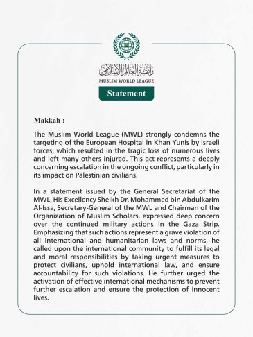 In a statement from the General Secretariat, His Excellency Sheikh Dr. Mohammed bin Abdulkarim Al-Issa, Secretary-General of the MWL and Chairman of the Organization of Muslim Scholars, expressed unwavering support and solidarity with UNRWA in its humanitarian mission to aid Palestinian refugees. His Excellency underscored the grave consequences of these persistent Israeli violations, which contravene all international and humanitarian laws and norms. He warned that these actions jeopardize ongoing efforts to alleviate the suffering in Palestinian territories and hinder the prospects for achieving a comprehensive and just peace.