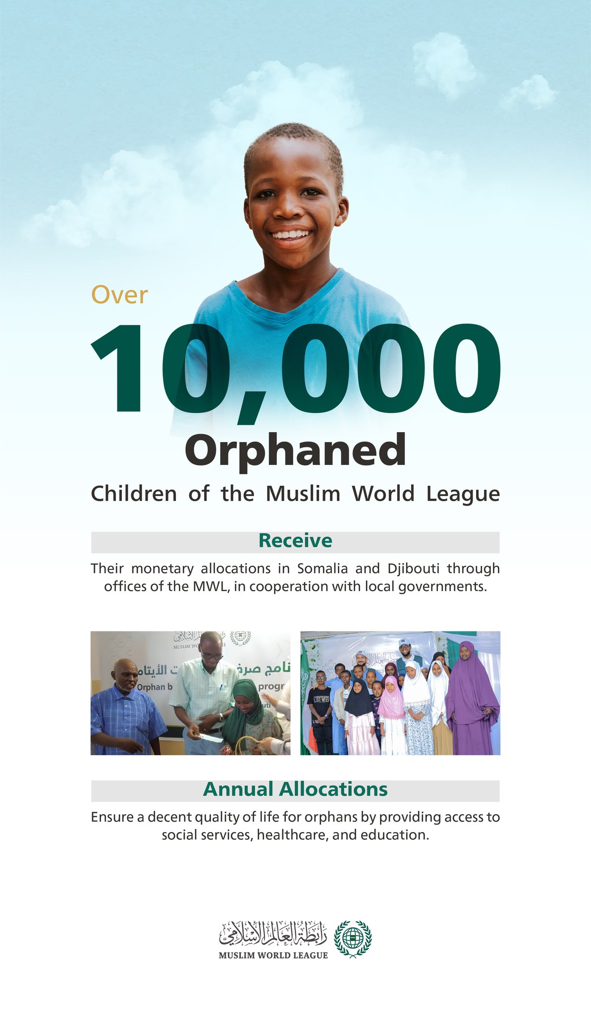 In cooperation with local governments, annual allocations have been distributed to over 10,000 orphaned children—both boys and girls—affiliated with the Muslim World League in Somalia and Djibouti.
