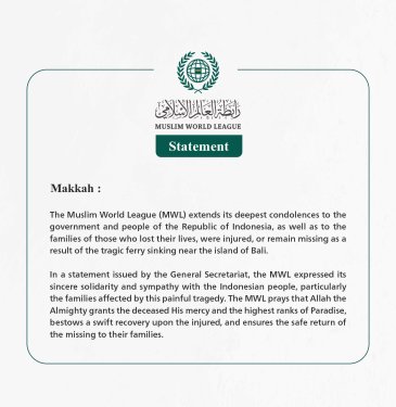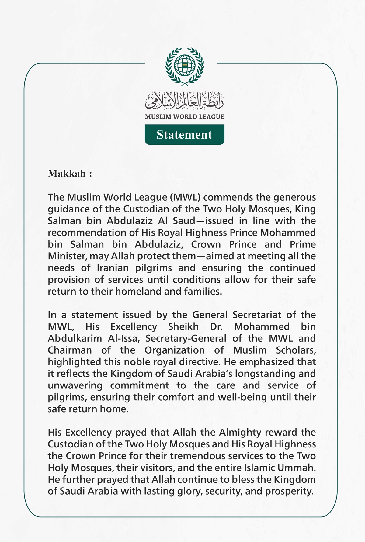The Muslim World League (MWL) commends the generous guidance of the Custodian of the Two Holy Mosques, King Salman bin Abdulaziz Al Saud—issued in line with the recommendation of His Royal Highness Prince Mohammed bin Salman bin Abdulaziz, Crown Prince and Prime Minister, may Allah protect them—aimed at meeting all the needs of Iranian pilgrims and ensuring the continued provision of services until conditions allow for their safe return to their homeland and families.