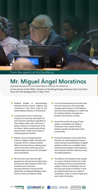 Highlights from the speech of His Excellency Mr. Miguel Ángel Moratinos, High Representative for the United Nations Alliance of Civilizations, at the launch of the MWL initiative on Building Bridges between East and West at the UN headquarters in New York