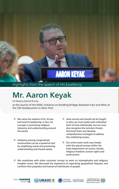 Highlights from the speech of His Excellency Mr. Aaron Keyak, US Deputy Special Envoy, at the launch of the MWL initiative on Building Bridges between East and West at the UN headquarters in New York: