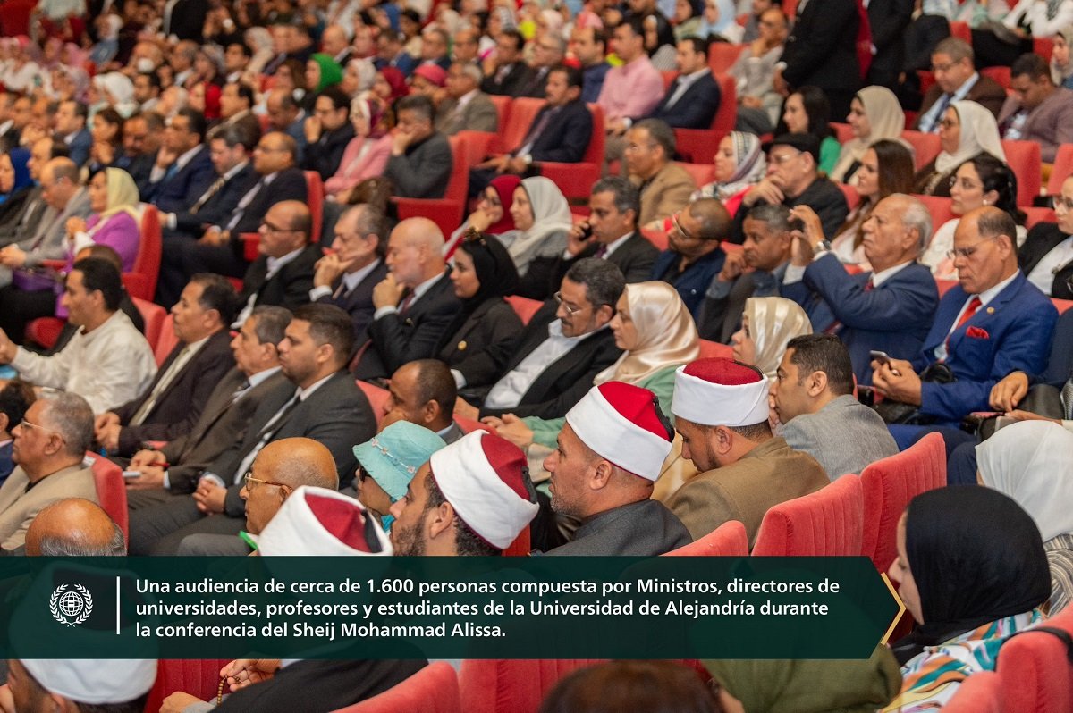 En presencia de cerca de 1600 personas, entre ellas Ministros, directores de universidades, decanos de facultades, académicos y estudiantes: el Secretario General Sheij Mohammed Al-Issa ofrece una conferencia en la Biblioteca de Alejandría sobre Oriente y Occidente.