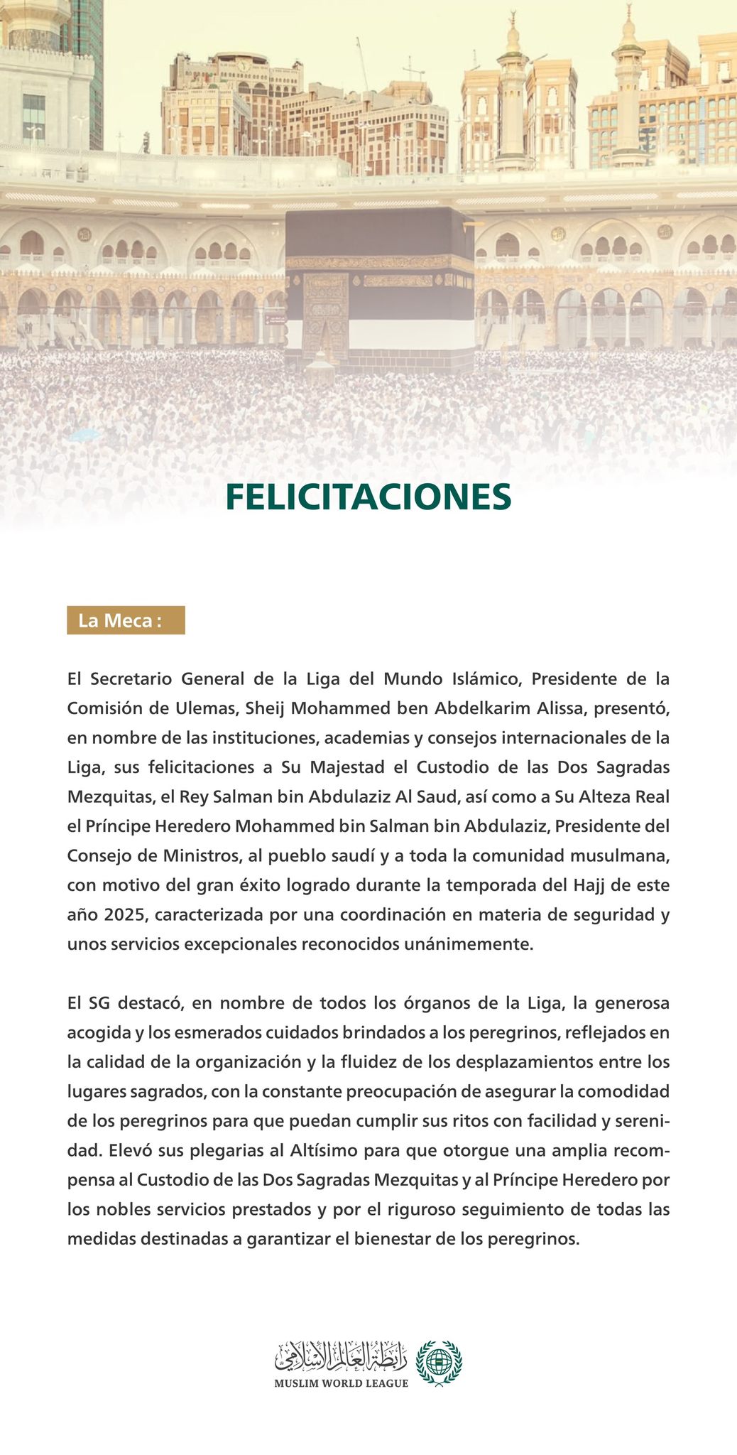 Felicitaciones de la Ligadel Mundo Islamico por el éxito en la organización del Hajj de este año 2025: