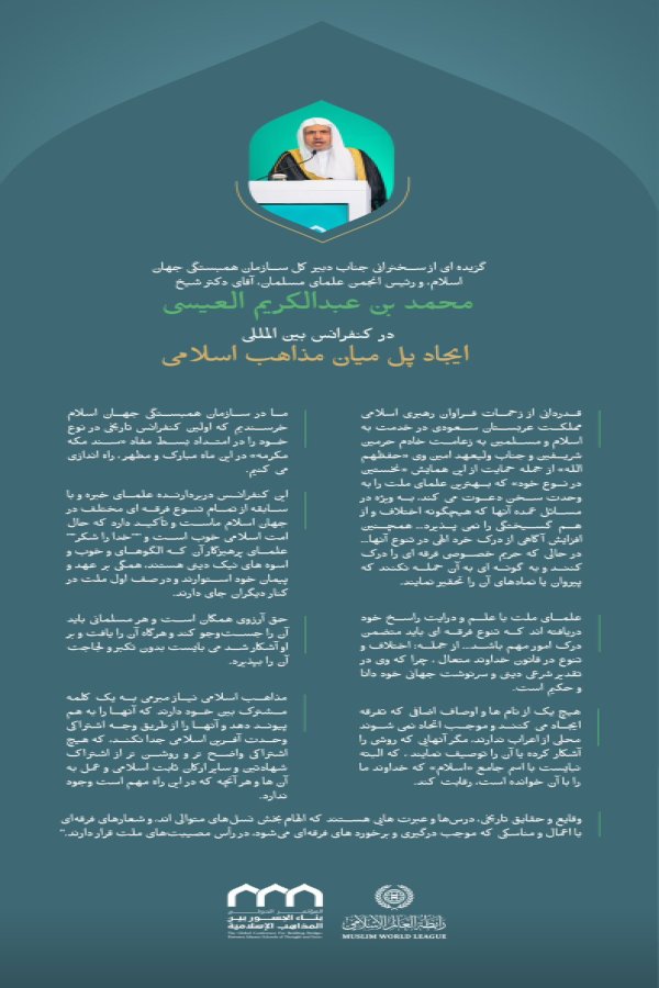 "از سخنان جناب دبیر کل، و رئیس انجمن علمای مسلمان، آقای دکتر شیخ محمد العیسی، خطاب به حضار در افتتاحیه کنفرانس بین المللی: «ایجاد پل میان مذاهب…
