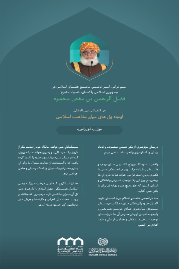 "فضیلت امیر جمعیت علماء اسلام در جمهوری اسلامی پاکستان، شیخ فضل الرحمن بن مفتی محمود، در سخنرانی خود در افتتاحیه کنفرانس : ""ایجاد پل…