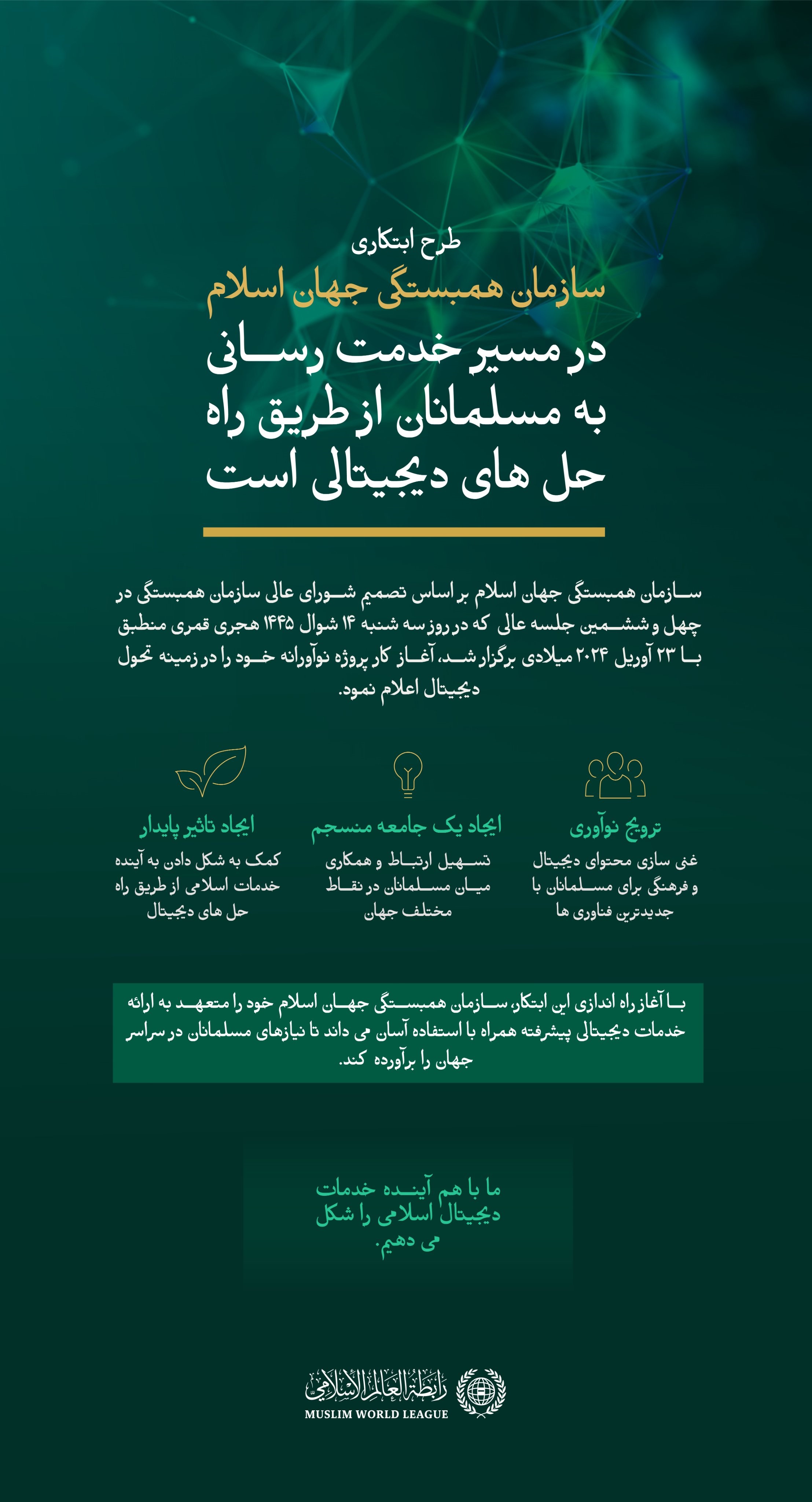در راستای ایجاد یک جهش کیفی در "غنی سازی محتوای دیجیتال اسلامی"... سازمان همبستگی جهان اسلام پروژه منحصر به فرد تحول دیجیتال خود را در راستای خدمت رسانی به مسلمانان سراسر جهان راه اندازی می کند که یک محیط دیجیتال اسلامی و تعاملی قابل اعتماد و ارزشمند را فراهم می کند و ارتباطات و تبادل میان مسلمانان را افزایش می دهد.