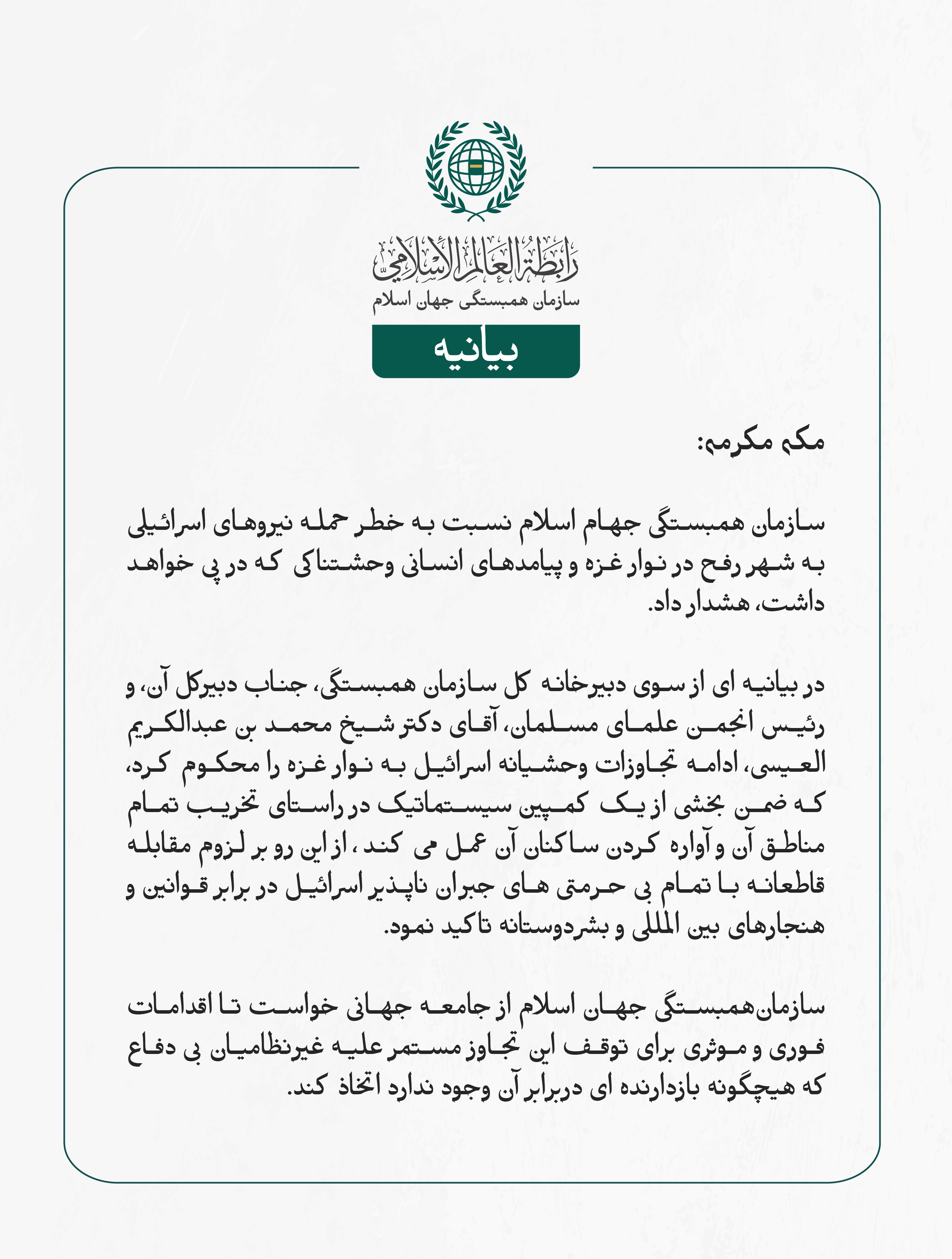 بيانیه سازمان همبستگی جهان اسلام : چهارشنبه, 8 می 2024 - 12:55