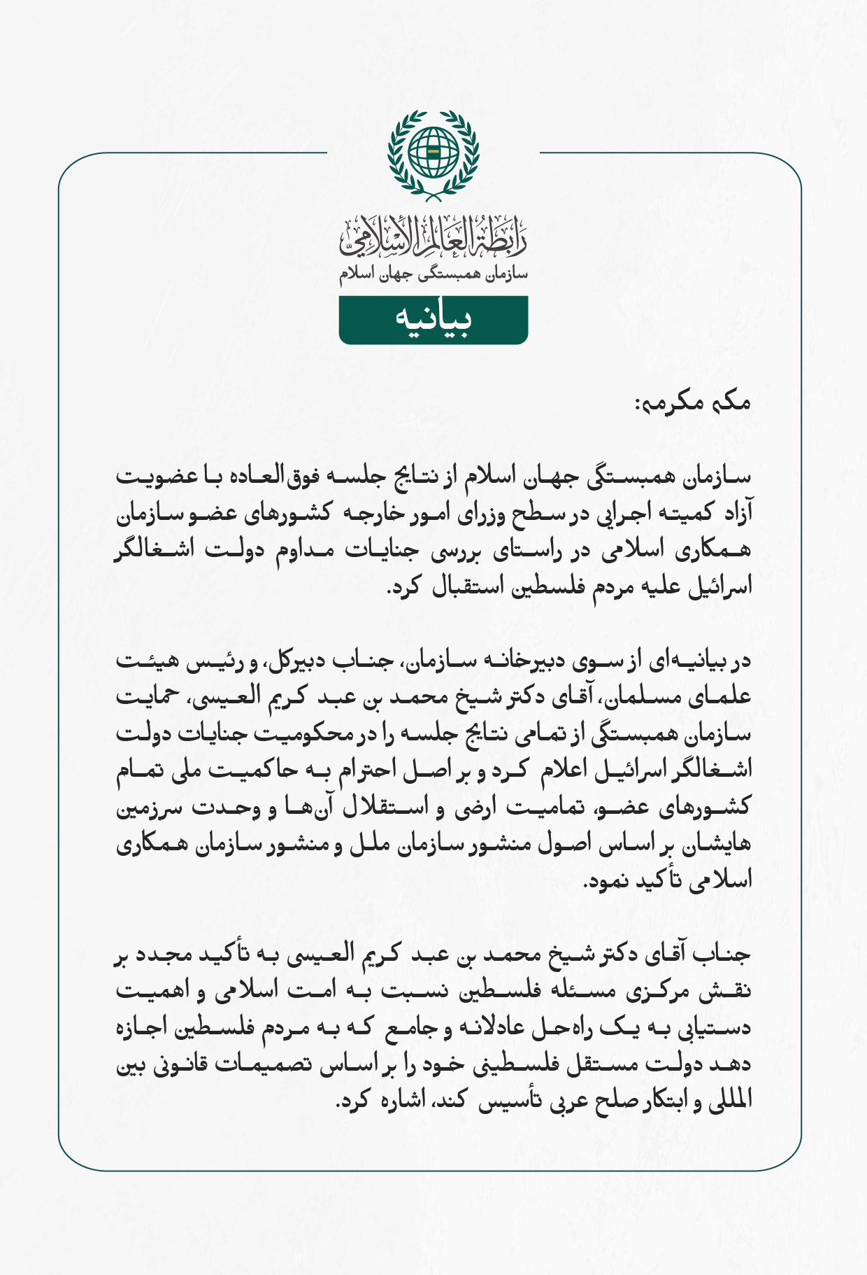 در بیانیهای از سوی دبیرخانه سازمان، جناب دبیرکل، و رئیس هیئت علمای مسلمان، آقای دکتر شیخ محمد بن عبد کریم العیسی، حمایت سازمان همبستگی از تمامی نتایج جلسه را در محکومیت جنایات دولت اشغالگر اسرائیل اعلام کرد و بر اصل احترام به حاکمیت ملی تمام کشورهای عضو، تمامیت ارضی و استقلال آنها و وحدت سرزمینهایشان بر اساس اصول منشور سازمان ملل و منشور سازمان همکاری اسلامی تأکید نمود.