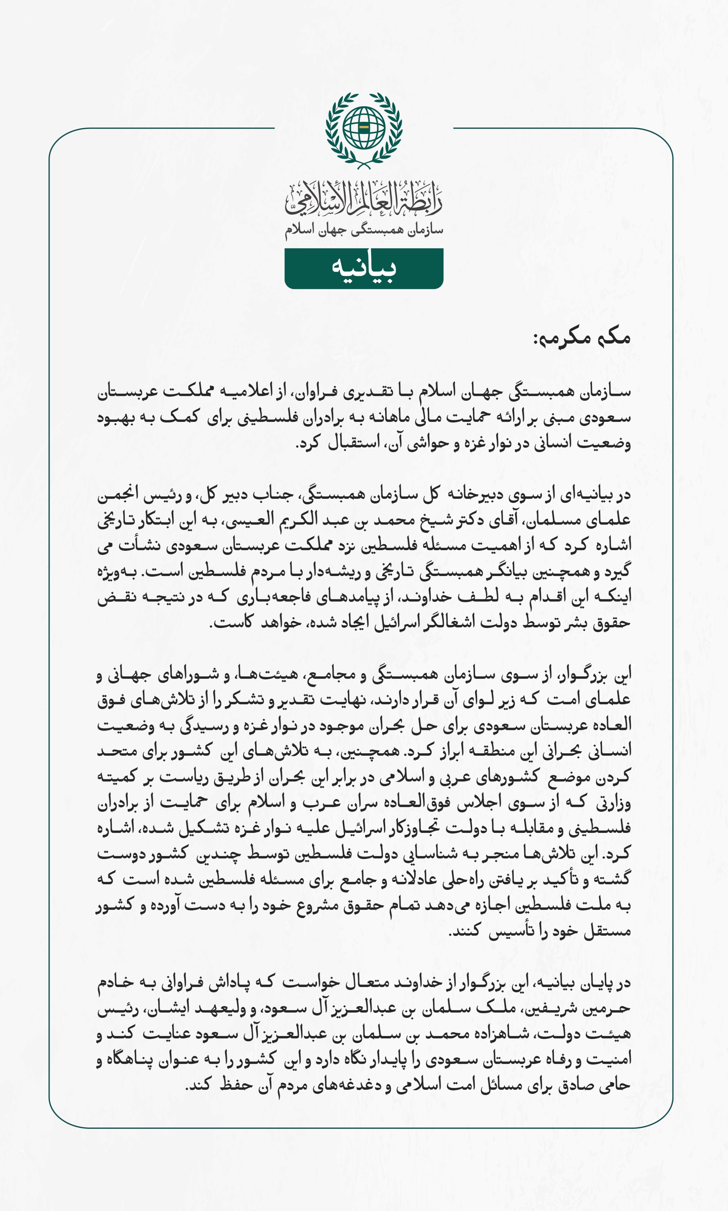 بيانیه سازمان همبستگی جهان اسلام : دوشنبه, 30 سپتامبر 2024 - 09:51