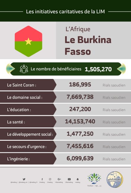 Le nombre total de bénéficiaires au Burkina Fasso des initiatives de la Ligue Islamique Mondiale s’élève à 1 505 270 personnes.
