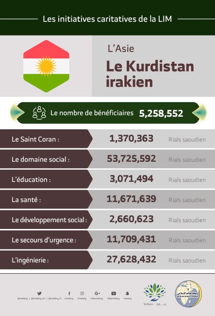Le nombre total de bénéficiaires au Kurdistan irakien des initiatives de la Ligue Islamique Mondiale s’élève à 5 258 552 personnes.