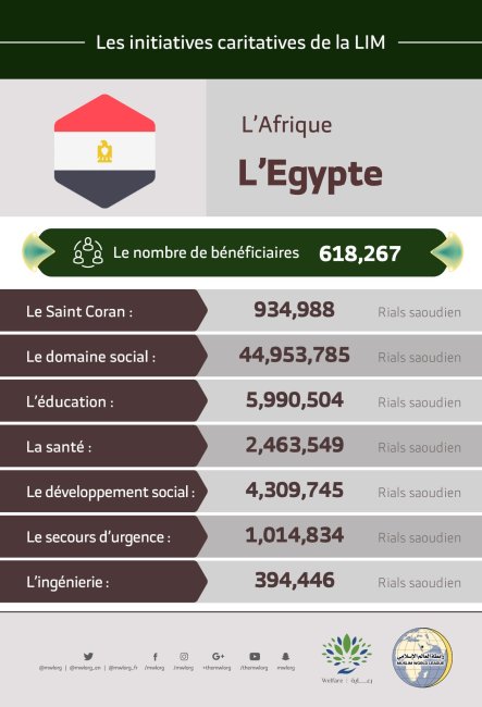 Le nombre total de bénéficiaires en Egypte des initiatives de la Ligue Islamique Mondiale s’élève à 618 267 personnes.