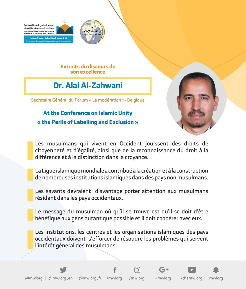 Dr. Alal Al-Zahwani devant 1200 personnalités islamiques de 127 pays lors du congrès de la Ligue Islamique Mondiale :”L’unité islamique, le danger de la classification et de l’exclusion” sous l’égide du Serviteur des Deux Mosquées au Haram à la Mecque.
