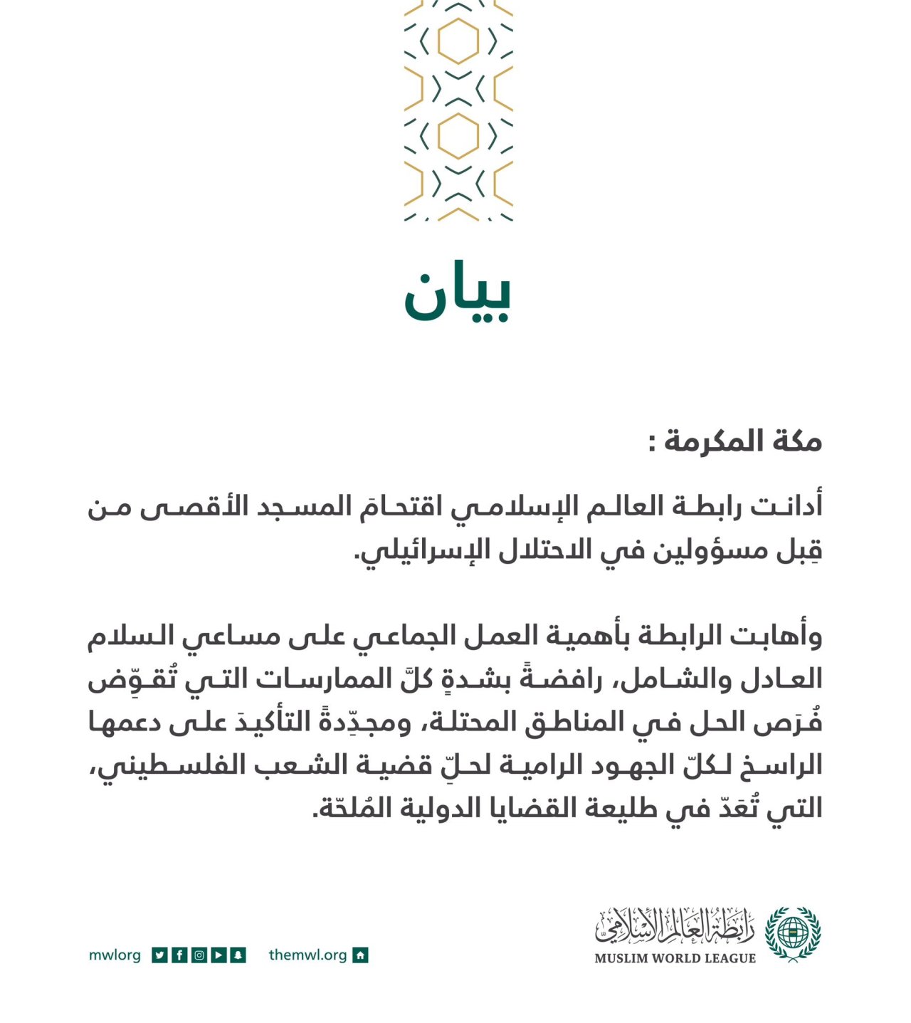 أدانت رابطة العالم الإسلامي اقتحامَ المسجد الأقصى من قِبل مسؤولين في الاحتلال الإسرائيلي.