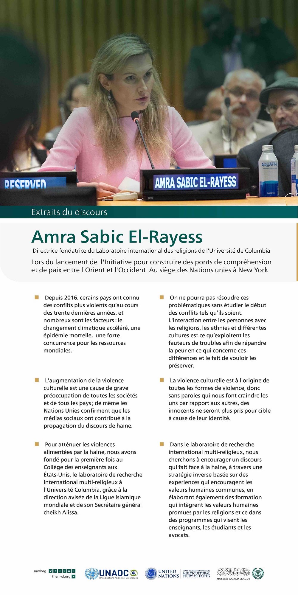 Extraits du discours de Amra Sabic El-Rayess lors du lancement de l’initiative de la Ligue islamique mondiale pour “construire des ponts de compréhension et de paix entre l’Orient et l’Occident “ depuis le siège des Nations Unies à New York :