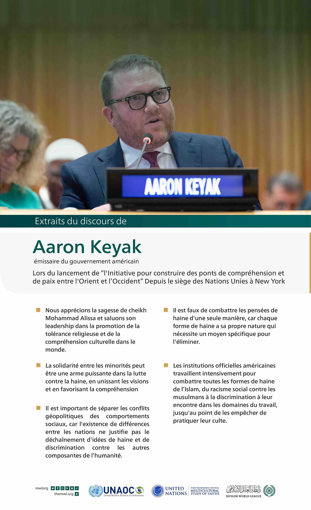 Extraits du discours de Aaron Keyak lors du lancement de l’initiative de la Ligue islamique mondiale pour “construire des ponts de compréhension et de paix entre l’Orient et l’Occident “ depuis le siège des Nations Unies à New York