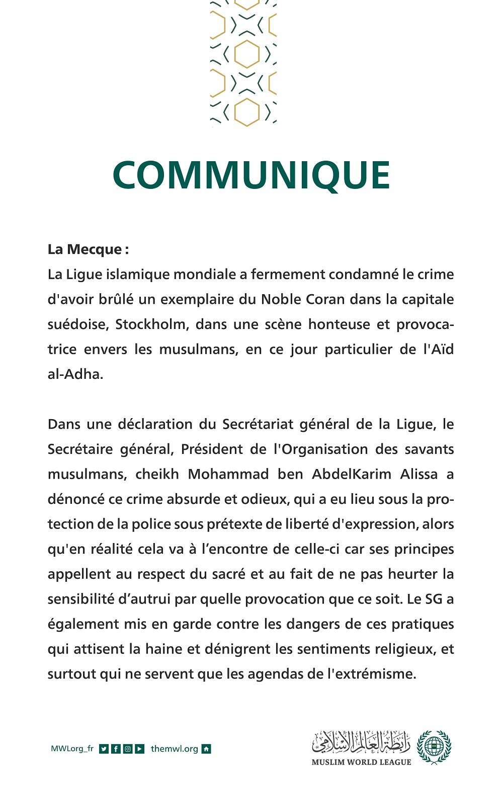 La Ligue islamique mondiale salue les efforts du Royaume d’Arabie saoudite et des États-Unis d’Amérique pour mettre fin à la guerre au Soudan.