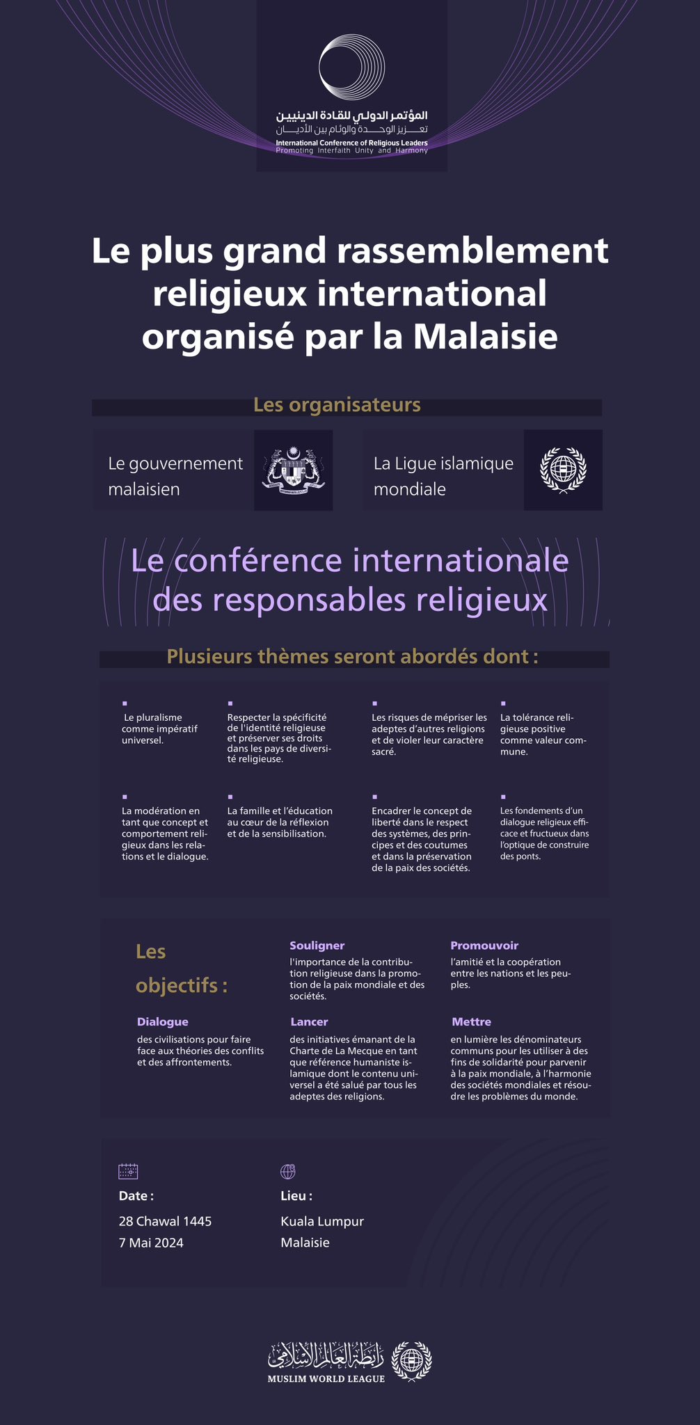 Organisé en partenariat entre le gouvernement malaisien et la Ligueislamiquemondiale. La capitale, Kuala Lumpur, accueille la Conférence internationale des responsables religieux. Découvrez les détails :