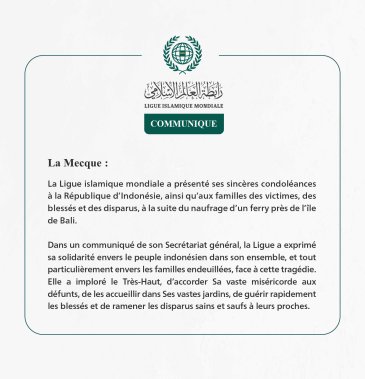 La Ligue islamique mondiale a adressé ses sincères condoléances à l’ensemble du peuple iranien, et en particulier aux familles des victimes, suite à l’explosion survenue dans un port de la ville de “Bandar Abbas” au sud de l’Iran. Elle a exprimé sa solidarité avec le peuple iranien face à cette tragédie, tout en souhaitant un prompt rétablissement aux blessés.
