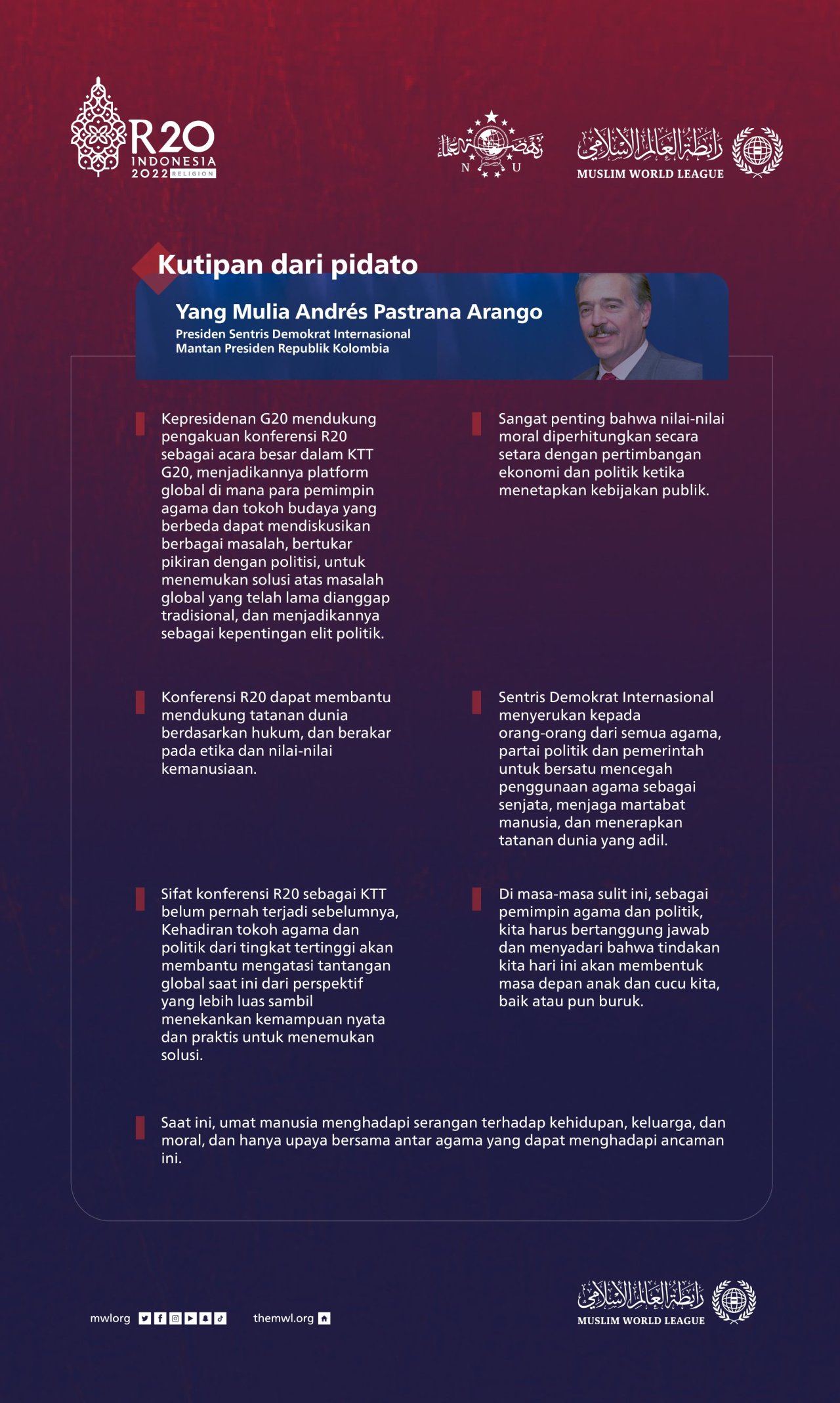 Poin-poin paling menonjol yang disampaikan oleh Presiden Sentris Demokrat Internasional, mantan Presiden Republik Kolombia, Andrés Pastrana Arango, selama berpartisipasi dalam KTTR20 di Bali: