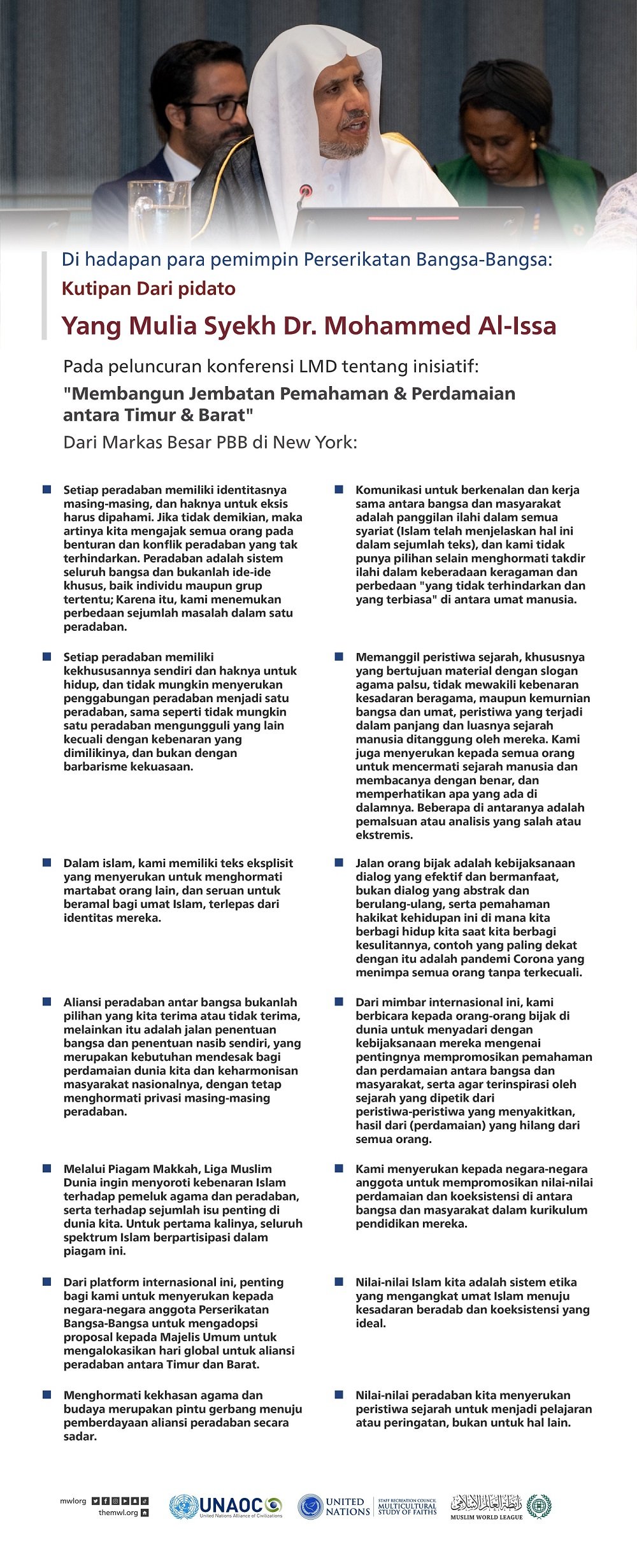 Kutipan dari pidato Yang Mulia Sekjen LMD, Ketua Asosiasi Ulama Muslim, Syekh Dr.Mohammad Al-issa pada peluncuran Inisiatif Liga Muslim Dunis tentang "Membangun Jembatan Pemahaman & Perdamaian antara Timur & Barat" dari Markas Besar PBB di New York: