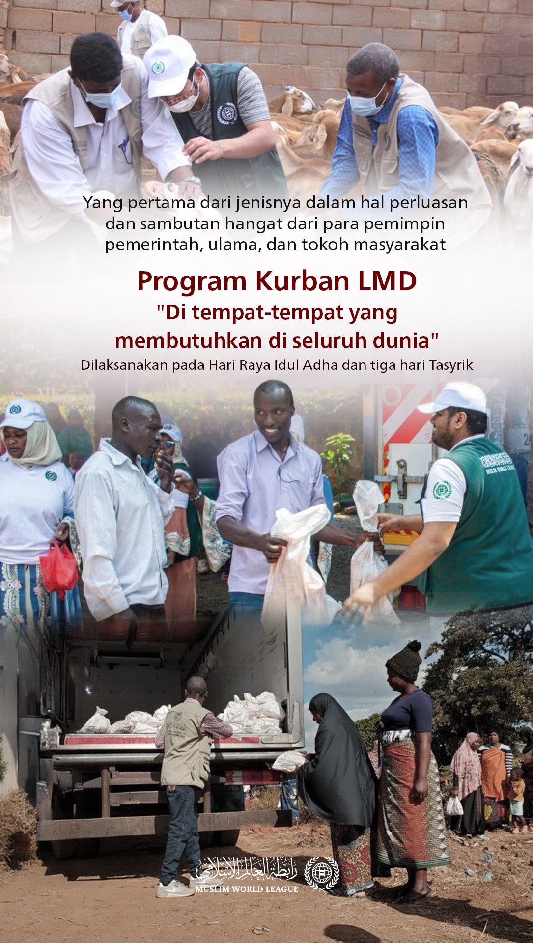 Kantor-kantor, pusat-pusat, dan perwakilan Liga Muslim Dunia di seluruh dunia melaksanakan program kurban pada “Hari Raya Idul Adha” dan “Tiga Hari Tasyrik” di seluruh negara yang membutuhkan, dengan sebagian besar tersebar di puluhan negara di Afrika dan Asia.