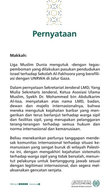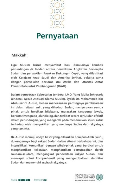 Liga Muslim Dunia menyampaikan keprihatinan dan kesedihan yang mendalam atas laporan dari PBB yang mengejutkan mengenai kondisi kemanusiaan yang sangat memprihatinkan, serta laporan tentang kelaparan yang melanda sejumlah wilayah di Sudan setelah Pasukan