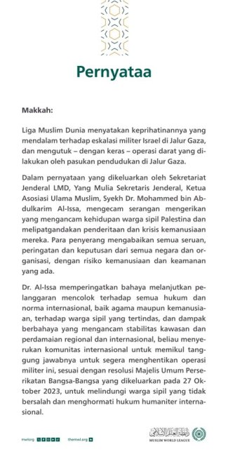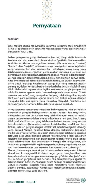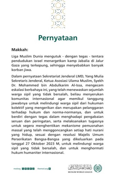 Makkah: h.Liga Muslim Dunia mengutuk keras serangan brutal yang kembali dilakukan oleh pasukan pemerintah pendudukan israel terhadap Jalur Gaza, yang telah menyebabkan jatuhnya banyak korban jiwa dari kalangan warga sipil yang tak bersalah