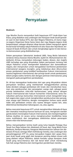 Liga Muslim Dunia mengecam dengan sangat keras gelombang kekerasan dan tindakan kriminal yang dilakukan para pemukim serta aparat kepolisian terhadap warga sipil, sarana kehidupan mereka, dan tempat-tempat suci di wilayah Palestina yang diduduki.