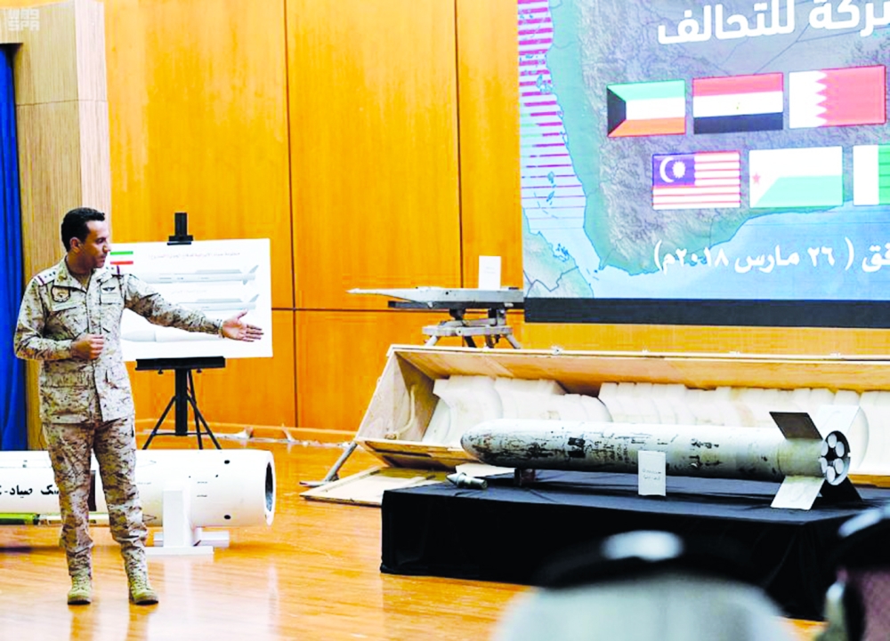 أكد المتحدث الرسمي لقوات التحالف «تحالف دعم الشرعية في اليمن» العقيد الركن تركي المالكي أن ما يقوم به النظام الإيراني من تهريب ودعم وتسليح للجماعات والمنظمات الإرهابية وتزويدها بقدرات نوعية كالصواريخ البالستية، والصواريخ الحرارية ومنظومة الطائرات بدون طيار وكذلك القوارب السريعة المفخخة يشكل تهديداً للأمن الإقليمي والدولي وخرقاً لمبادئ القانون الدولي والقرارات الأممية ذات الصلة.