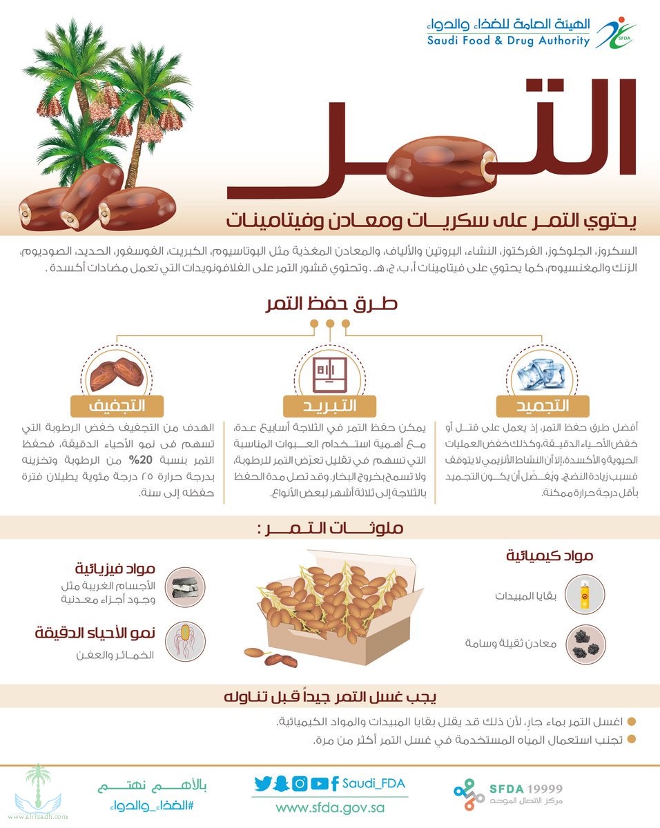 وأبانت صحيفة الرياض نقلا عن الهيئة أن هناك ملوثات للتمر منها، بقايا المبيدات، ومعادن ثقيلة وسامة، والأجسام الغريبة مثل وجود أجزاء معدنية، ونمو الأحياء الدقيقة (الأحياء والعفن).
