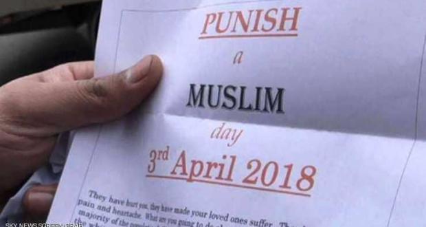 دعت رسائل توزع في أرجاء بريطانيا إلى عقاب المسلمين، في 3 أبريل المقبل(حسب ما ذكرت صحيفة المدينة)، فيما فتحت شرطة مكافحة الإرهاب تحقيقا، على خلفية احتمال حدوث جرائم كراهية ضد مسلمين، خصوصا أن الرسائل تعرض مكافآت على من يمتثل بها، وفق عدد من النقاط. فالعنف اللفظي يمنح المنفذ 10 نقاط، ونزع الحجاب عن امرأة يمنح 25 نقطة، أما الإقدام على حرق مسجد، فيوفر ألف نقطة، دون توضيح ماهية هذه النقاط.وفي المقابل دانت منظمات حقوقية مضمون الرسائل، ووصفته بالمروع، لإثارته الكراهيةَ العنصرية. وأكدت أن عائلات مسلمة عدة باتت قلقة بشأن حريتها في التجول وسلامة أطفالها.وأكدت شرطة مقاطعة ويست يوركشير، وسط بريطانيا، تلقيها بلاغات عدة بشأن الرسائل. وأعلن سكان مدينتي لندن وبرمنغهام كذلك أنها وصلتهم «إلى منازلهم».