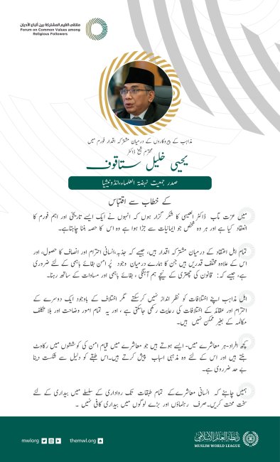 محترم شیخ ڈاکٹر یحیي خلیل ستاقوف، صدر جمعیت نہضۃ العلماء انڈونیشیا کے مشترکہ اقدار فورم ریاض میں خطاب سے اقتباس: