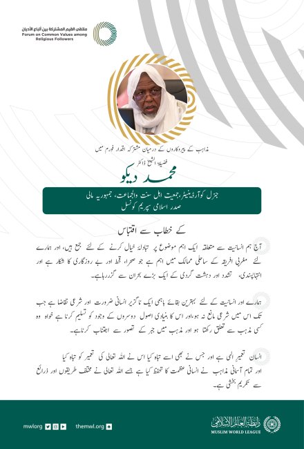 محترم شیخ ڈاکٹر محمود دیکو،جنرل کوآرڈینیٹر،جمعیت اہل سنت والجماعہ،جمہوریہ مالی، صدر اسلامی سپریم کونسل کے مشترکہ اقدار فورم ریاض میں خطاب سے اقتباس: