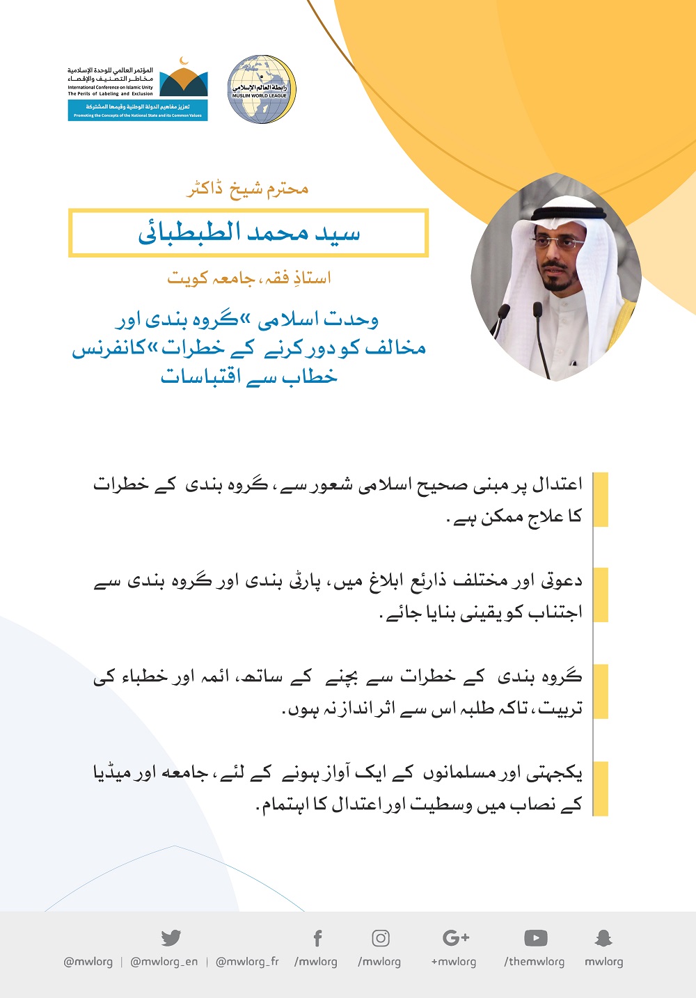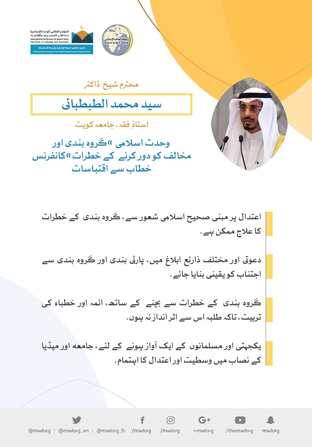 محترم شیخ ڈاکٹر سید محمد الطبطبائی استاذِ فقہ، جامعہ کویت وحدت اسلامی"گروہ بندی اور مخالف کو دور کرنے کے خطرات"کانفرنس خطاب سے اقتباسات