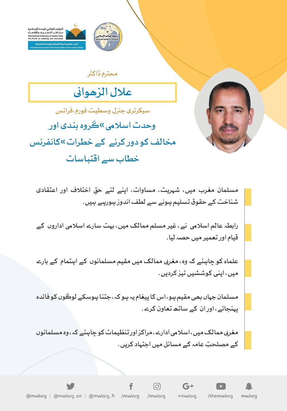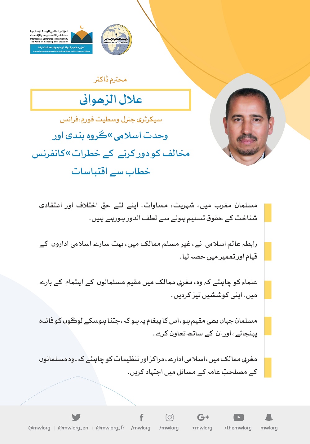 محترم ڈاکٹر علال الزھوانی سیکرٹری جنرل وسطیت فورم، فرانس وحدت اسلامی"گروہ بندی اور مخالف کو دور کرنے کے خطرات"کانفرنس خطاب سے اقتباسات
