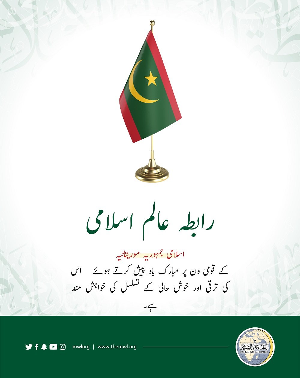 رابطہ عالم اسلامی کی طرف سے اسلامی جمہوریہ موریتانیہ کے قومی دن کے موقع پر مبارک باد کا پیغام: