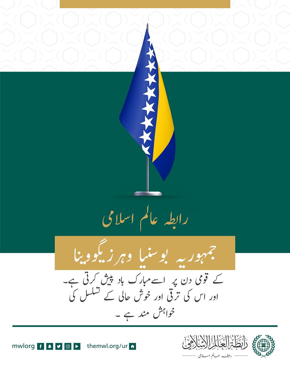 رابطہ عالم اسلامی کی طرف سے جمہوریہ بوسنيا و ہرزیگووینا کے قومی دن کے موقع پر مبارکباد کا پیغام: