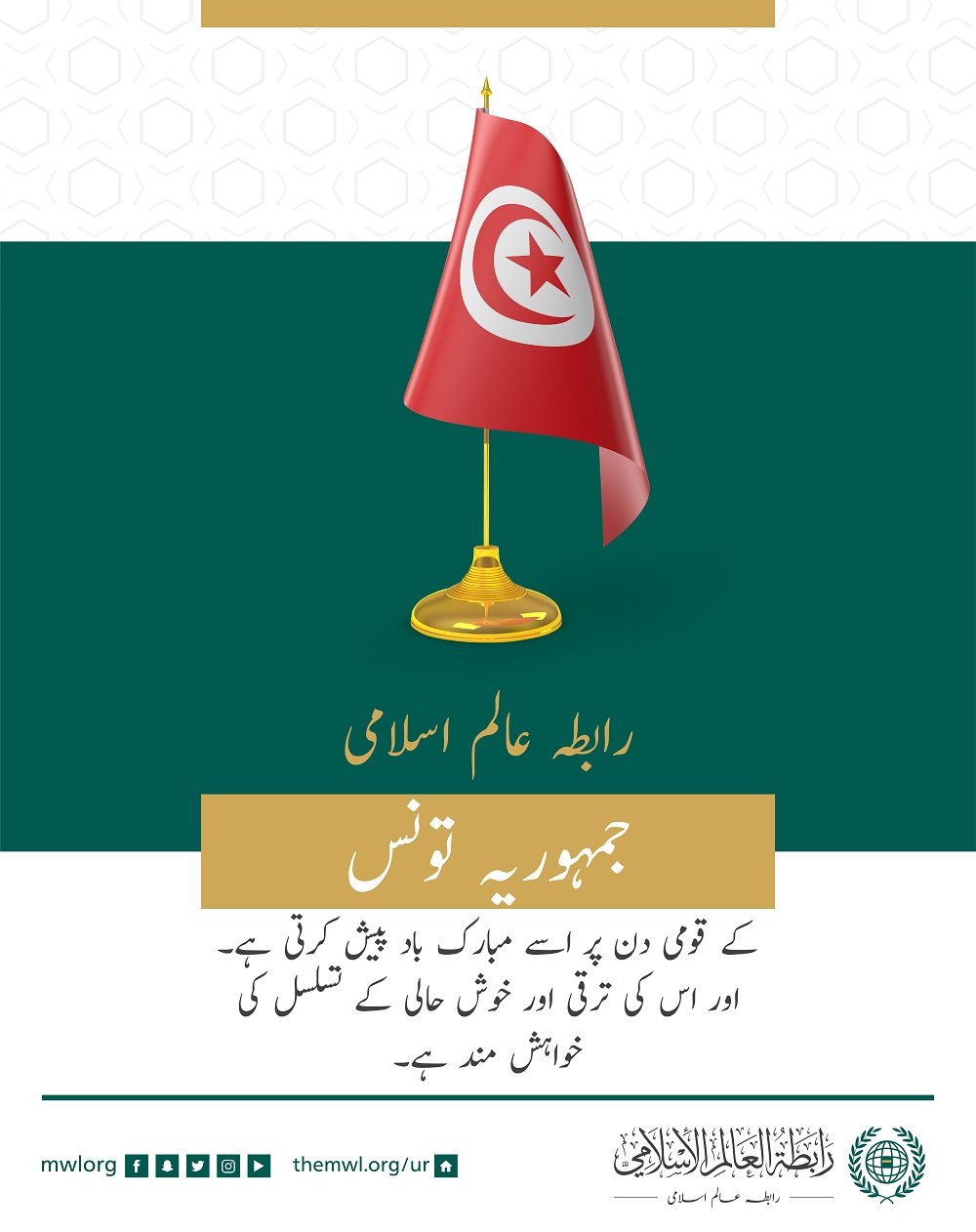 رابطہ عالم اسلامی کی طرف سے جمہوریہ تونس کے قومی دن کے موقع پر مبارک باد کا پیغام: